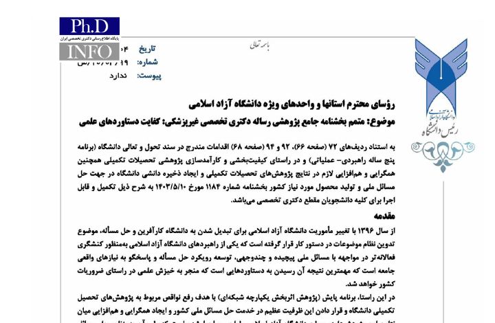 به استناد ردیفهای ۷۲ صفحه (۶۶) ۹۲ و ۹۴ صفحه (۶۸) اقدامات مندرج در سند تحول و تعالی دانشگاه (برنامه پنج ساله راهبردی عملیاتی و در راستای کیفیت بخشی و کارآمدسازی پژوهشی تحصیلات تکمیلی همچنین همگرایی و هم افزایی لازم در نتایج پژوهشهای تحصیلات تکمیلی و ایجاد ذخیره دانشی دانشگاه در جهت حل مسائل ملی و تولید محصول مورد نیاز کشور بخشنامه شماره ۱۱۸۴ مورخ ۱۴۰۳٫۵٫۱۰ به شرح ذیل تکمیل و قابل اجرا برای کلیه دانشجویان مقطع دکتری تخصصی میباشد.